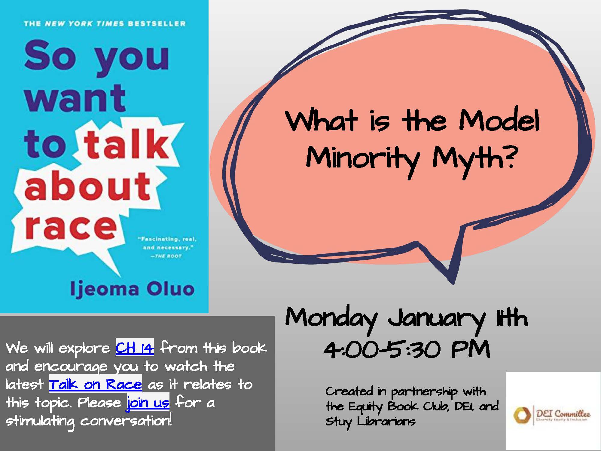 We are pleased to announce our 2nd Equity Book Talk of the school year, presented by the Equity Book Club and the DEI Committee. Please join us from 4:00-5:30 PM on Monday, January 11th to discuss the Model Minority Myth. Please register for the event here or at the link in the attached flyer.