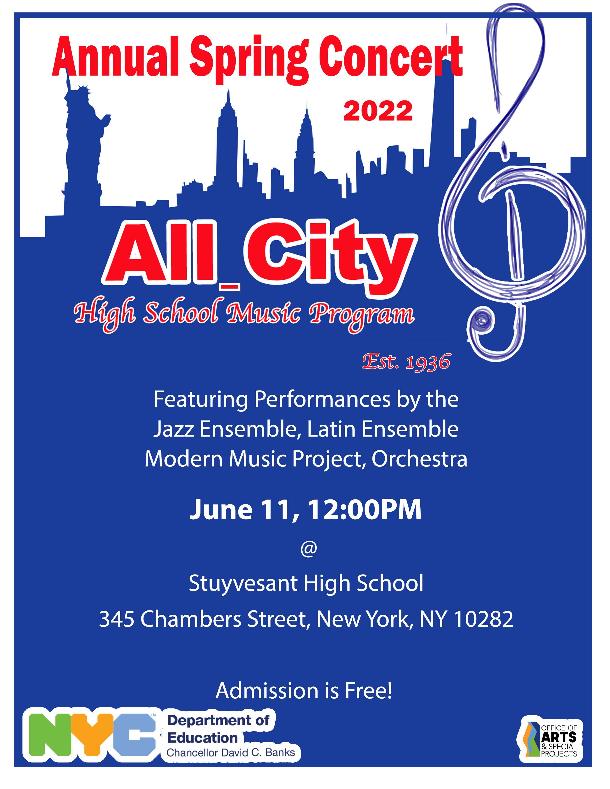 Mr. Harold Stephan shares that Stuyvesant will be hosting the All-City Spring Concert at 12pm on June 11, 2022. Admission is FREE and the concert will feature by the Jazz ensemble, Latin ensemble, Modern Music ensemble and Orchestra.