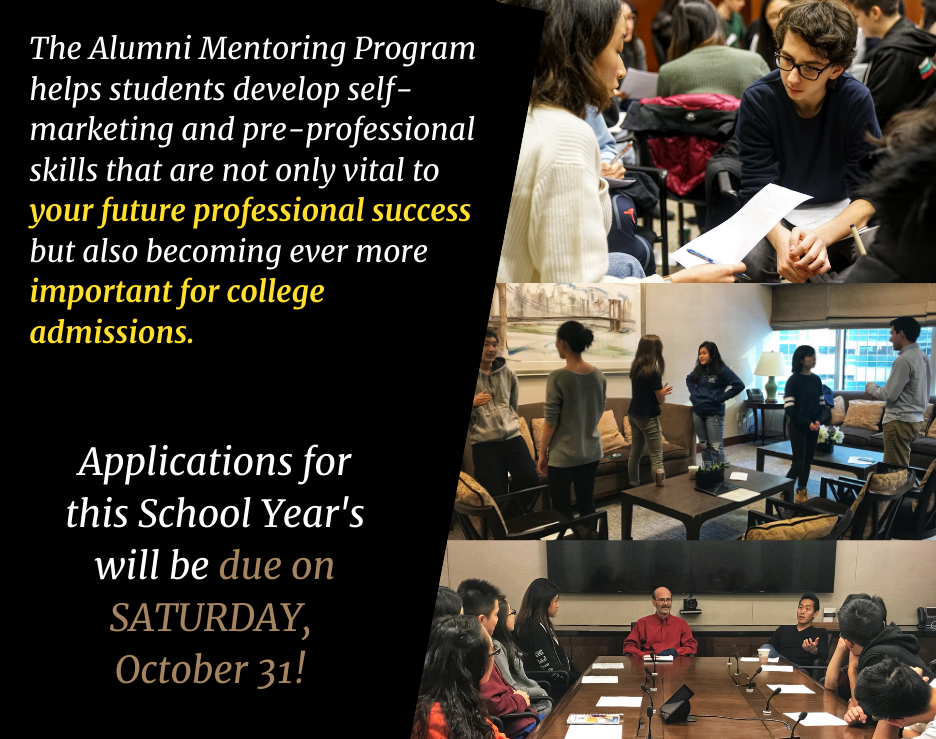 The Alumni Mentoring Program is a year-long program with a time commitment of 5 - 6 hours per month. Application for this school year will close next Saturday, October 31st. Our General Interest Meeting will be on Thursday, October 29 at 5PM. You already spend countless hours every week on your schoolwork and extracurriculars. So what is another few hours per month to make sure you learn the skills needed to highlight your hard work in the best light possible? College Admissions Consulting can easily cost hundreds to thousands of dollars. The Alumni Mentoring Program will provide you with the same knowledge and skill set for free thanks to the support and generosity of alumni and the Alumni Association.