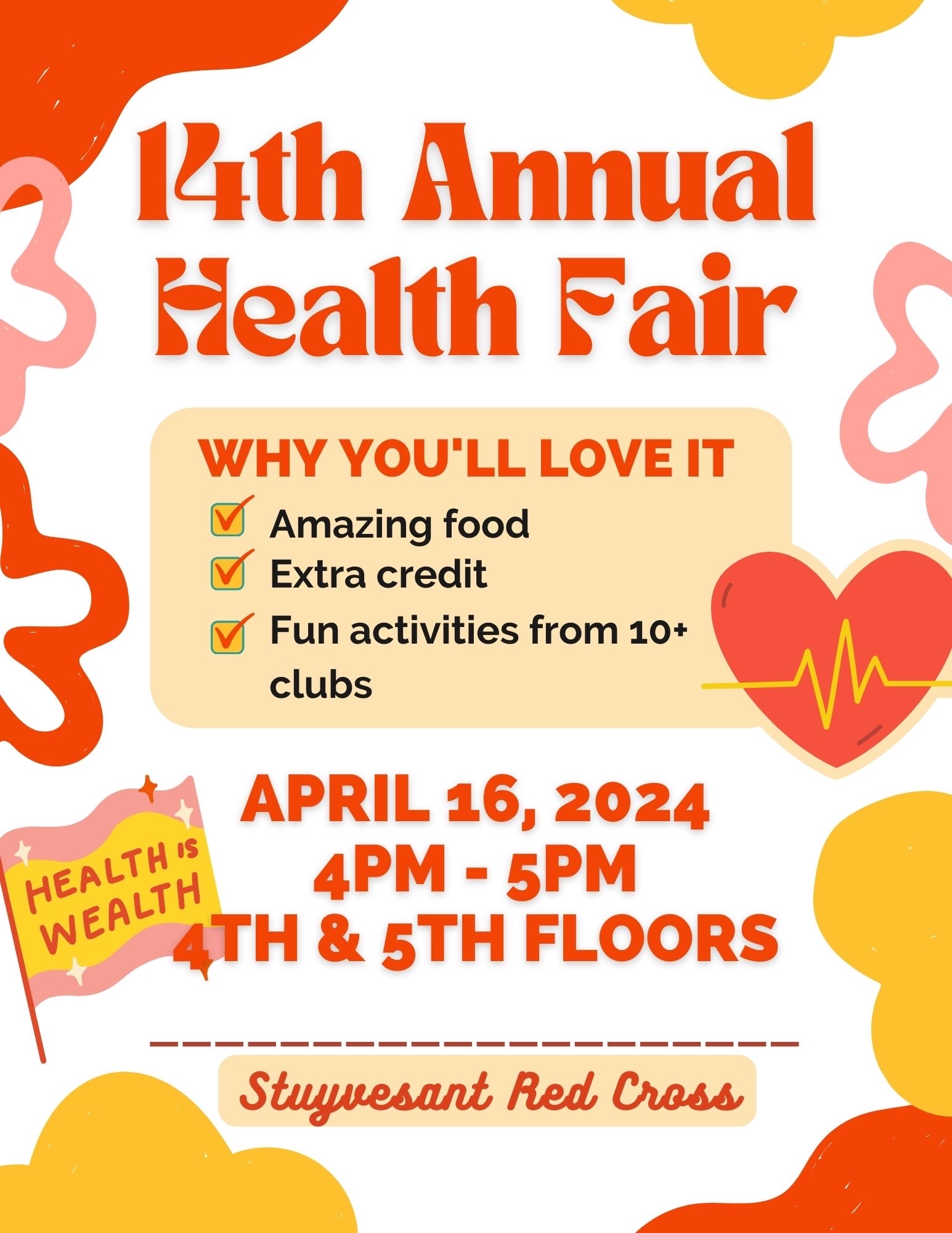 On Tuesday, April 16th, come and bring your friends to the 5th floor cafeteria from 4pm - 5pm for the 14th Annual Health Fair, hosted by Stuyvesant Red Cross in collaboration with 10+ clubs and sports teams. There will be free + nutritious food, brain games, pullup + other fitness challenges, NYPD safety booths, prizes for students who visit events and complete challenges, and more physical / mental / environmental health activities!