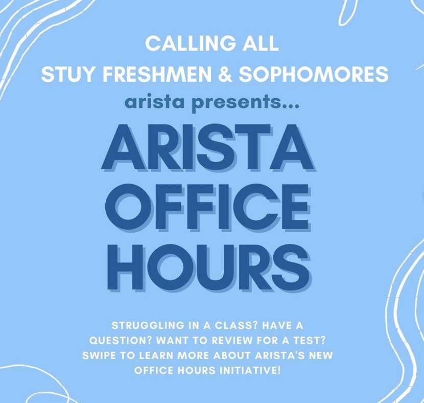 ARISTA is excited to announce its Office Hours initiative to provide another opportunity for freshmen and sophomores to receive academic help from experienced upperclassmen. Each day of the week (besides Friday), ARISTA will be hosting a Zoom meeting from 3-4 PM with upperclassmen tutors ready to meet with you in a breakout room to answer questions, help you review/study for an upcoming exam, explain a concept, etc. You can find the links to the Zoom meetings on our Office Hours calendar on the ARISTA website, stuyarista.org. Each weekday will focus on a specific academic area: