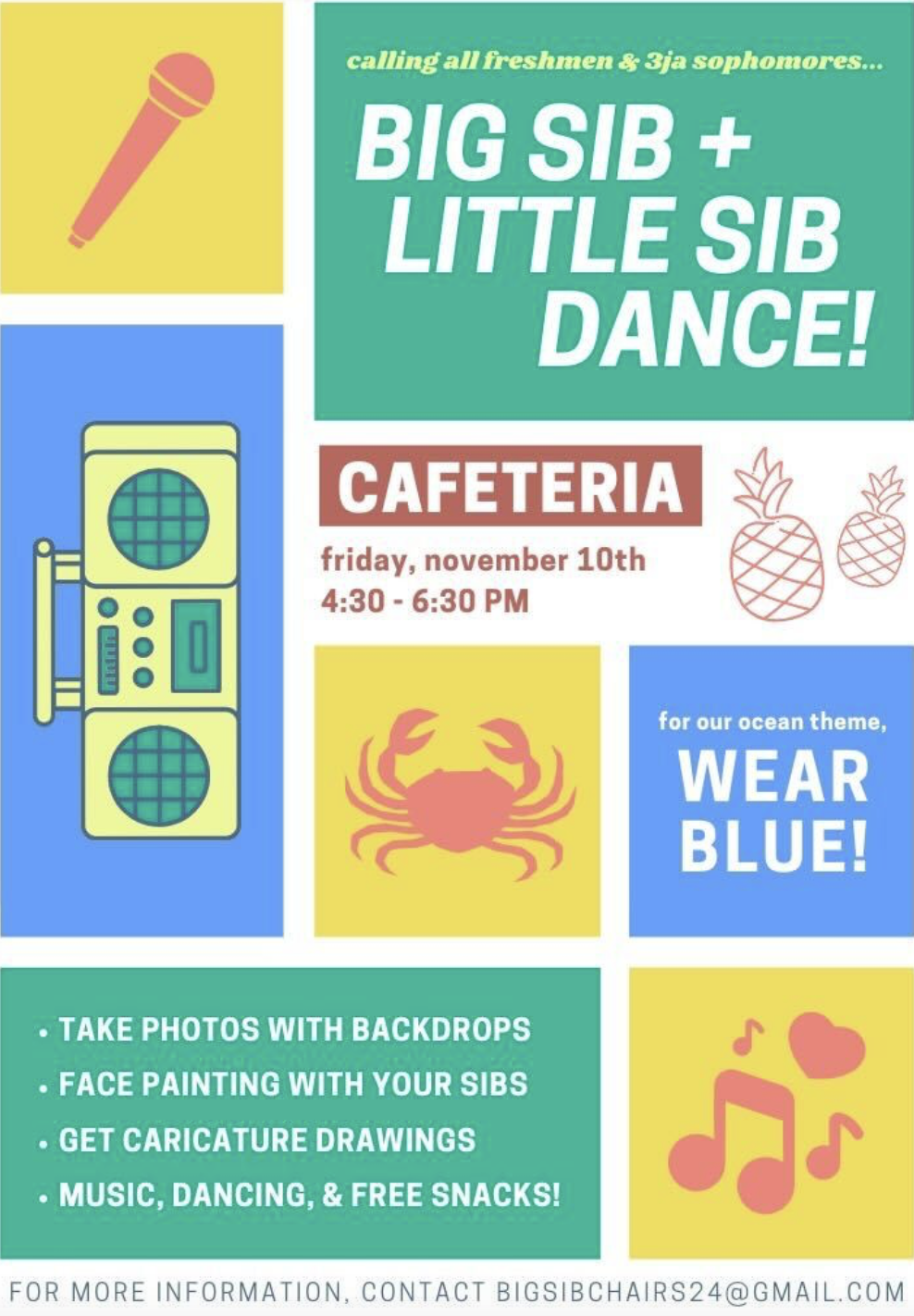 Little Sibs mark your calendars for the Big-Sib Little Sib dance on Friday November 10th, 4:30 to 6:30 pm! All your big sibs will be there at the cafeteria along with snacks and fun activities.