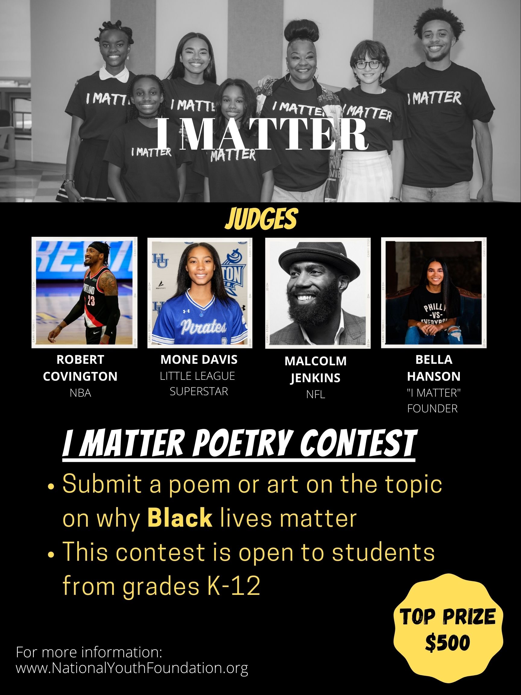 Would you like to win $500 and become a published poet? We are pleased to announce the 2022 "I Matter" poetry and art competition on why Black Lives Matter. Students from all over the world, in grades K-12, are invited to submit poetry and art on the theme of social justice. Ten finalists will win $100 and the top poet wins $500. All winners will have their work included in the 2022 "I Matter" book. The judges are Rob Covington of the NBA, Malcolm Jenkins of the NFL, Little League superstar Mo'ne Davis and "I Matter" Founder Isabella Hanson.