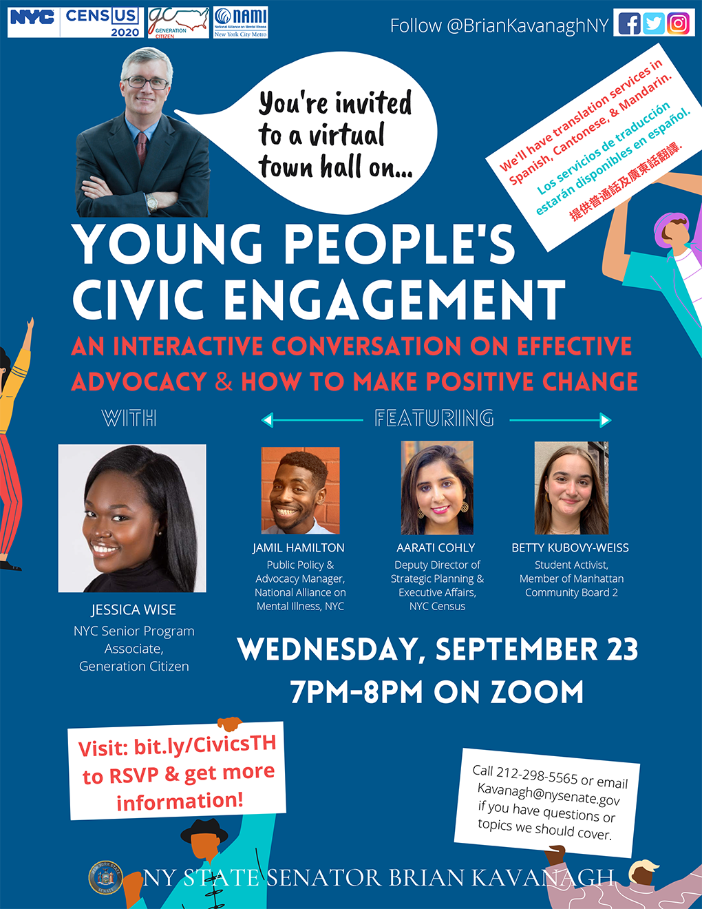 The office of Senator Brian Kavanagh to invite you, your students, and teachers to our town hall on Young People’s Civic Engagement this coming Wednesday, September 23, from 7pm-8pm.