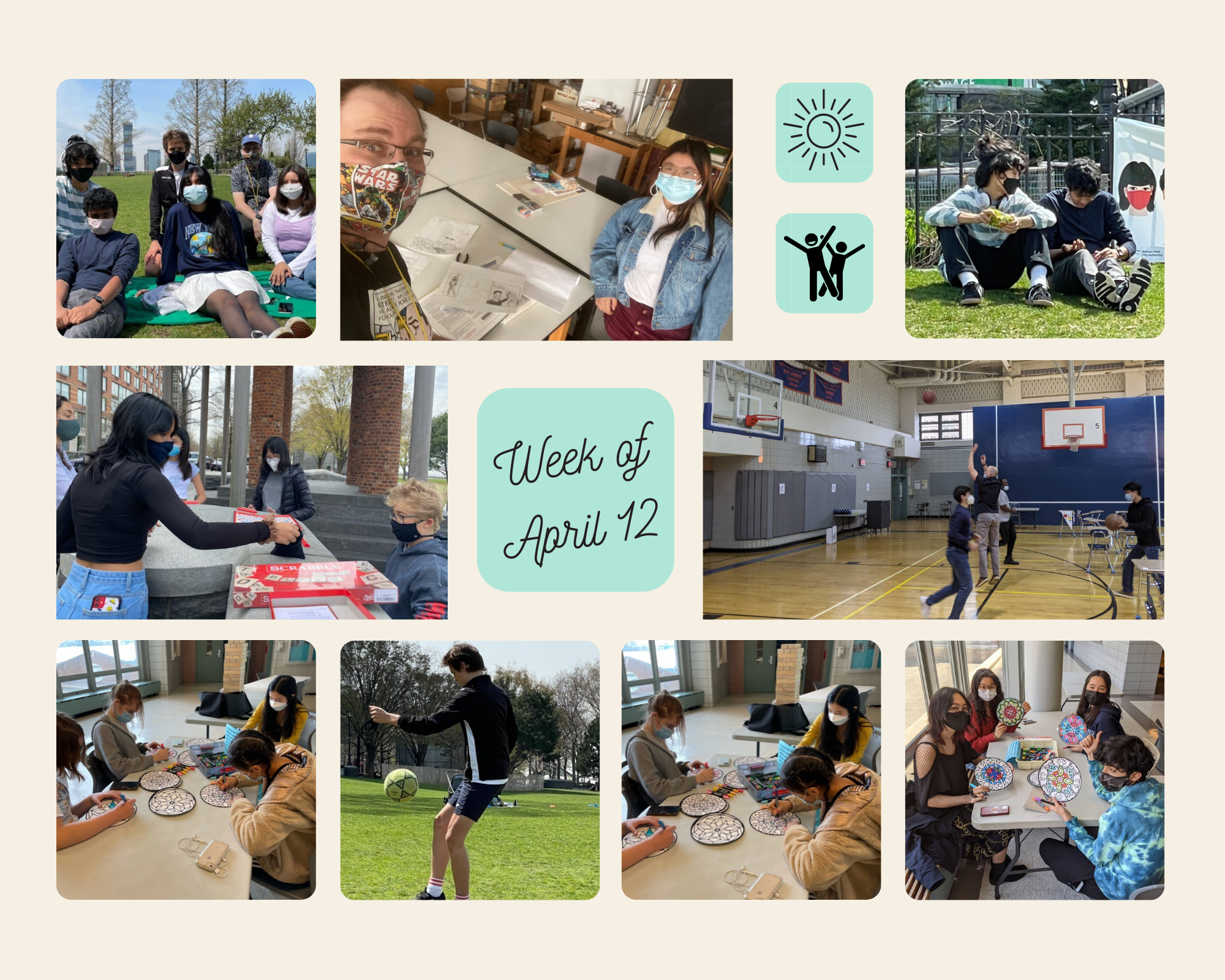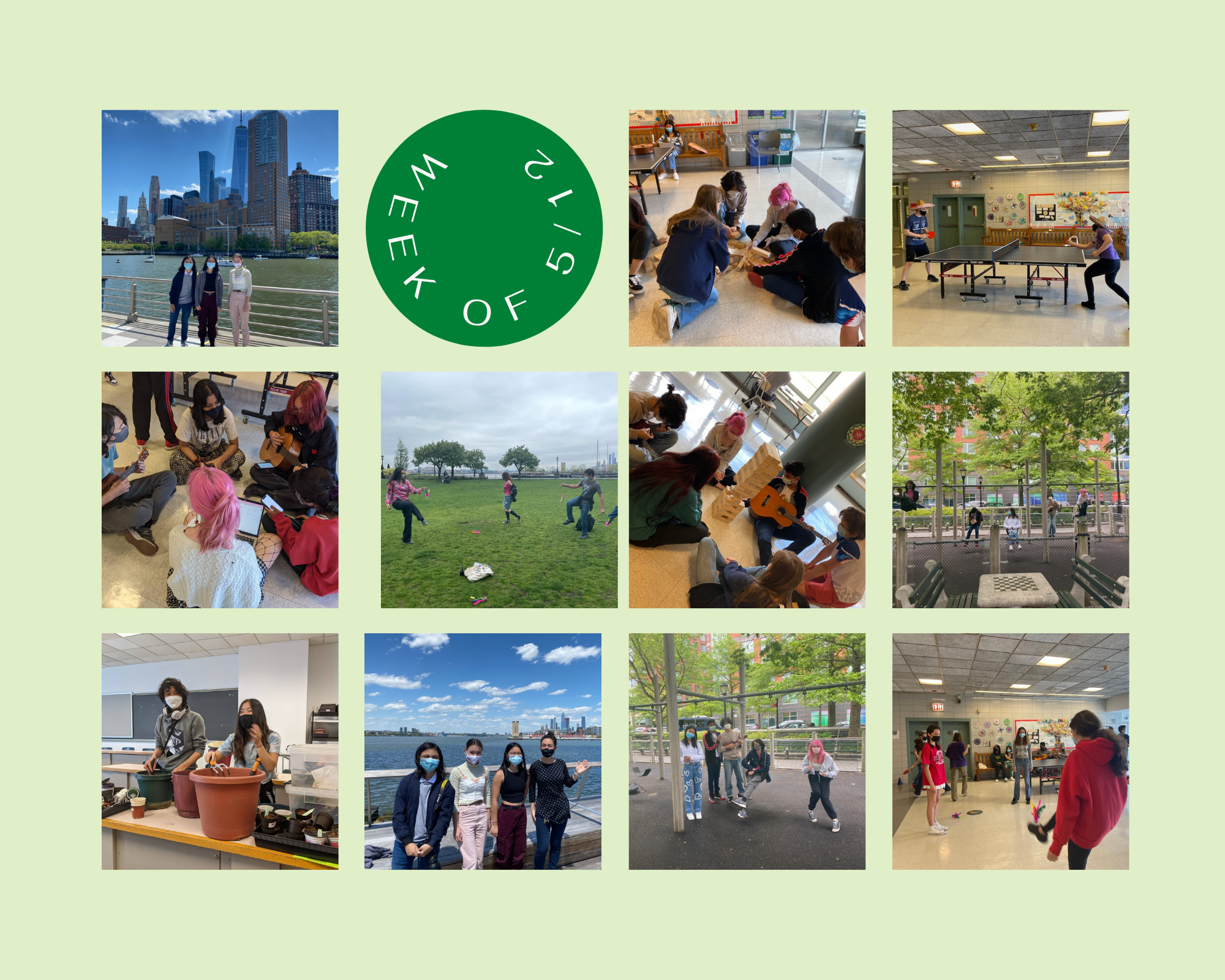 WEEK OF MAY 10 2021 - 'Students enjoyed Vitamin D with Ms. P' - enjoying the sunshine in Rockefeller Park with Ms. Pedrick swinging together and chatting; in 'Miles with McAuliffe' students went on brisk walks on the Hudson Greenway with Ms. McAuliffe. Students began seed planting in room 737 for our Rooftop Garden overseen by Ms. Maggio. They also enjoyed playing music and singing together while kicking back with a game of giant Jenga and playing ping pong during breaks. Ms. Zhang came in to teach students a traditional Chinese game of shuttlecock as well.