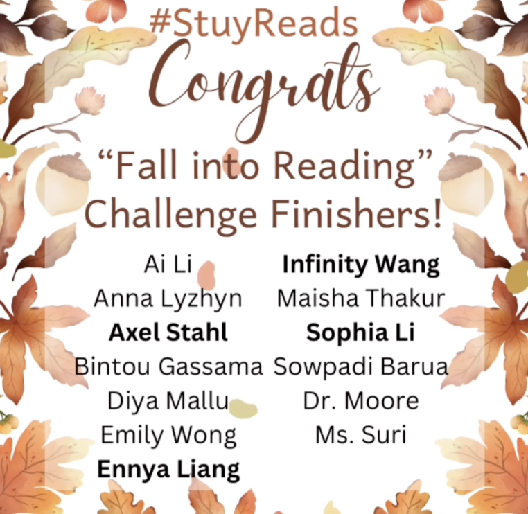 The following students and faculty members completed the Stuy Reads "Fall Into Reading" Challenge: