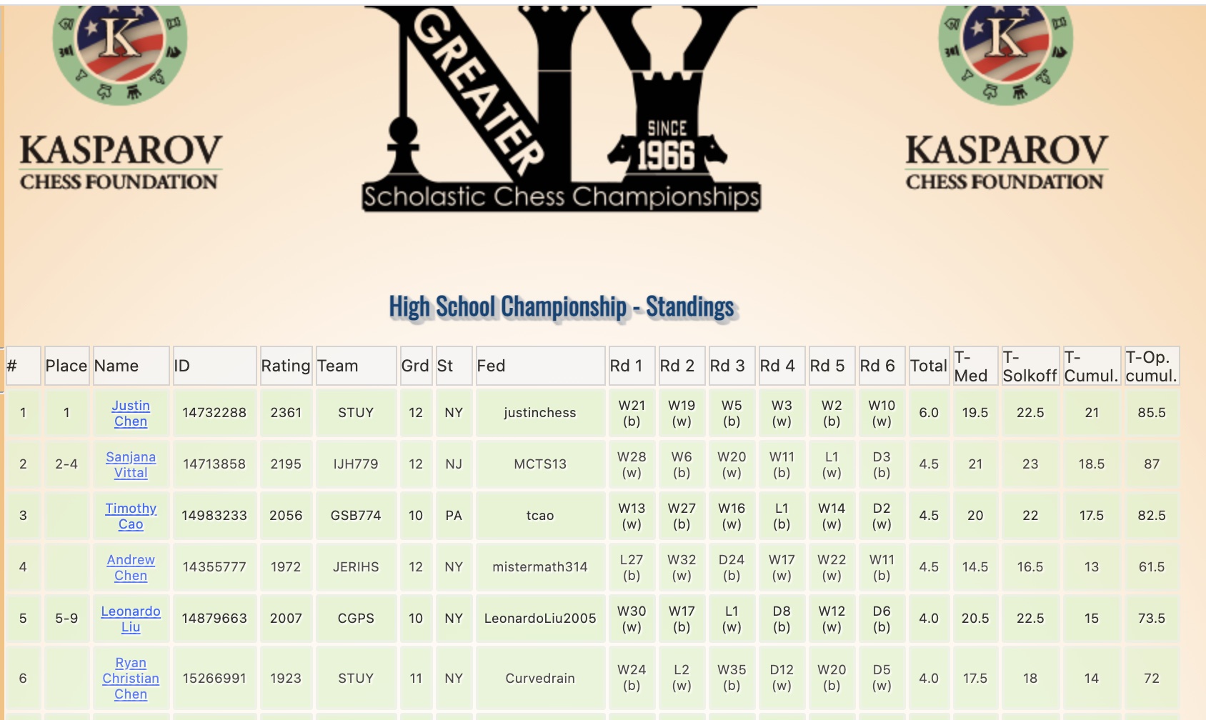 Coach Bill Boericke weekend the Stuyvesant Chess Team competed in the biggest regional tournament, the Greater New York Scholastic Chess Championship. Justin Chen (senior), Ryan Chen (junior), Charles Hua (freshman), and Daniel Fridlyand (junior) led Stuyvesant to 1st place in the Team standings with a total score of 16.5 points over arch rivals Jericho High School (16 points) and Columbia Grammar and Prep (12.5 points).