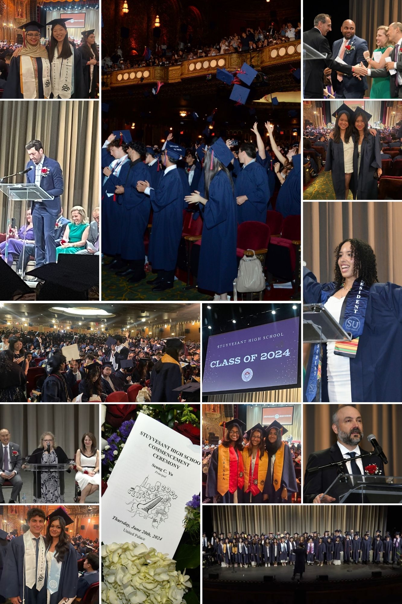Congratulations to the class of 2024 on the 165th commencement of Stuyvesant High School last week! On June 20, 2024, we celebrated our graduates at the United Palace Theater together. The ceremony included special guest speaker, Billy Eichner (Stuy '96), who was introduced by our beloved speech & debate coach and English teacher, Mr. Julie Sheinman who is retiring this year after 40 years of dedicated service in the DOE. We also enjoyed faculty speaker Mr. Gary Rubenstein, Principal Yu, and our student speakers including Ms. Amanda Cissé (SU President), Anthony Chen (Senior Caucus co-president). Zidane Karim (Senior Caucus co-president), Pranjal Modi (Salutatorian), and Vincent D'Angelo (Valedictorian). Our Parent Association co-presidents, Ms. Neiha Bhandari and Ms. Alice Chen also addressed our families and in collaboration with the Indicator Yearbook, presented a wonderful video of our seniors. Alumni Association president, Ms. Elena Tetelbaum welcomed the class of 2024 as official Stuyvesant Alumni. Our senior chorus members performed You Raise Me Up and led us in the National Anthem with their beautiful voices. Finally Assistant Principal Ms. Casey Pedrick along with Principal Yu certified our class of 2024 graduates in their celebratory tap toss. Much thanks to Coordinator of Student Affairs, Mr. Matt Polazzo for all the months of planning and hard work on this wonderfully smooth graduation. Special thanks to our PA volunteers and the Alumni Association for their support of this amazing celebration. We are wishing all our graduates much success and happiness in their next journey ahead!