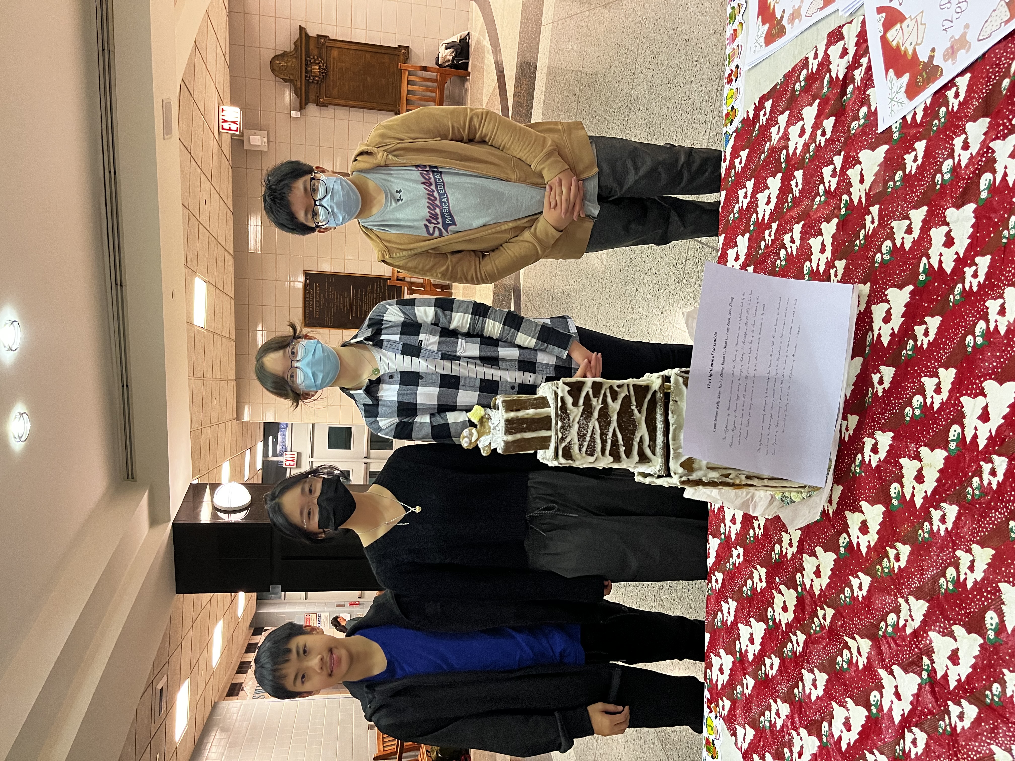Ms. Lina Rocchio shares congratulations to students Ethan Cheung Kelly Shaw, Brian Lim and Kathy Zhong (pictured) Jason Zhang and Amy Zhou (not pictured) who made this gingerbread monument to represent the lighthouse of Alexandria. which is considered one of the seven Wonders of the world during the Cultural Preservation Club's Gingerbread making contest just before the holiday break!