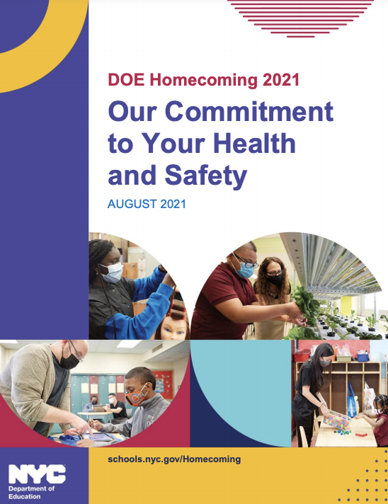 This week, DOE released the DOE Homecoming Health and Safety Guide for families, which includes the latest health and safety precautions that will be in place when schools open for school year 2021-22 to provide a safe and healthy in-person learning experience for all students. Please share the Homecoming Guide with families in your school community as soon as possible; translations will also be available at schools.nyc.gov/homecoming in the coming days.