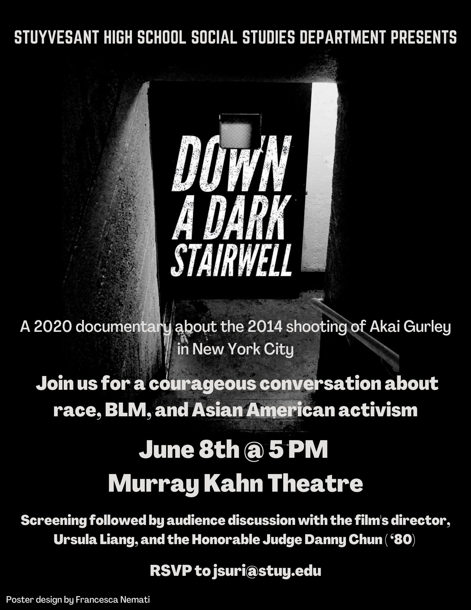 Join the Social Studies Department on June 8, 2022 at 5pm in the theater for a special Documentary screening of Down a Dark Stairwell; a 2020 documentary about the 2014 shooting of Akai Gurley in NYC.