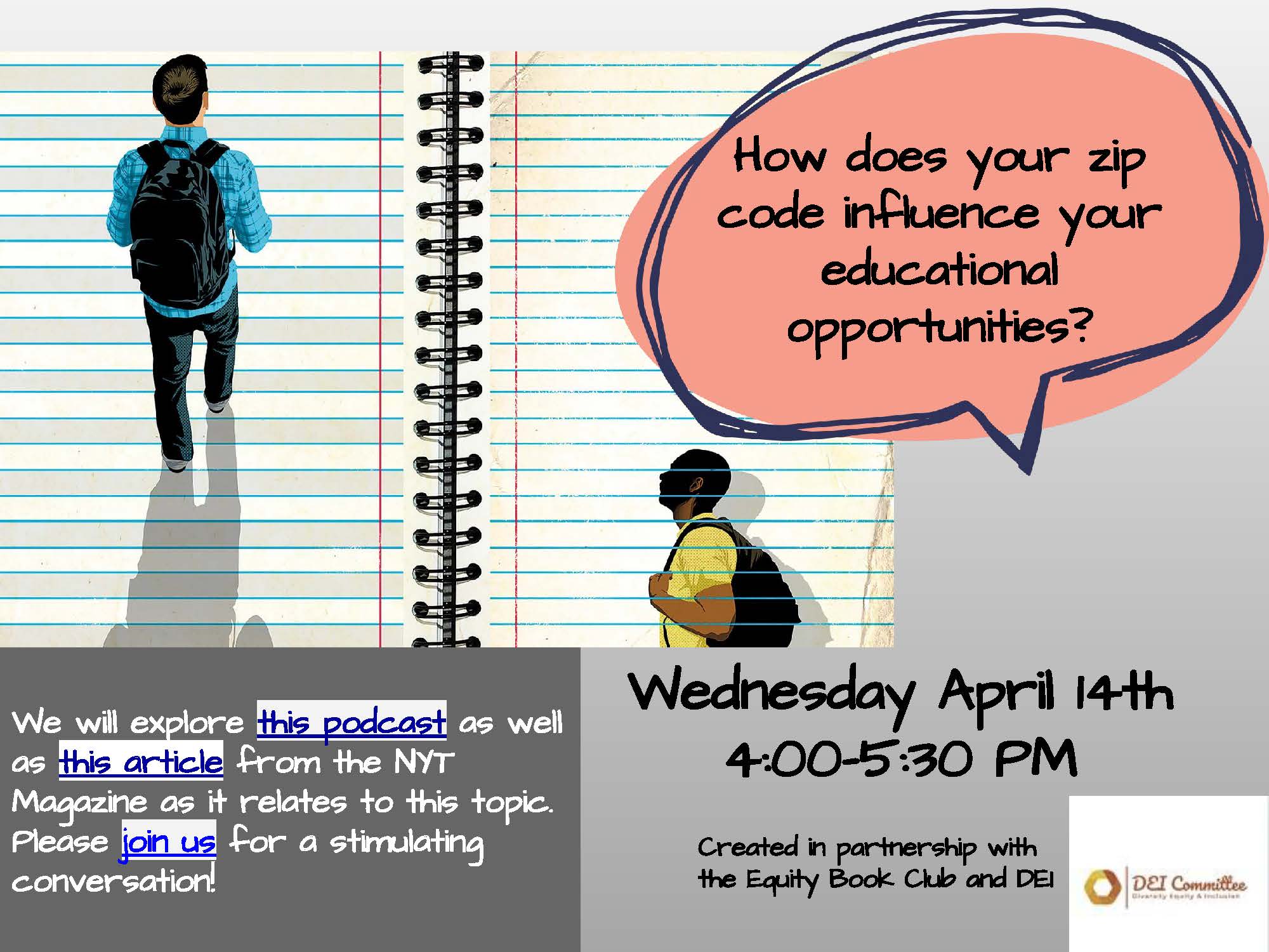 We are pleased to announce our 4th Equity Book Talk of the school year, presented by the Equity Book Club and the DEI Committee. Current faculty and administratorus are invited to join from 4:00-5:30 PM on Wednesday, April 14th to discuss the role of social class and geography in public schools and the NYC school system. Please register for the event using the link emailed to you..