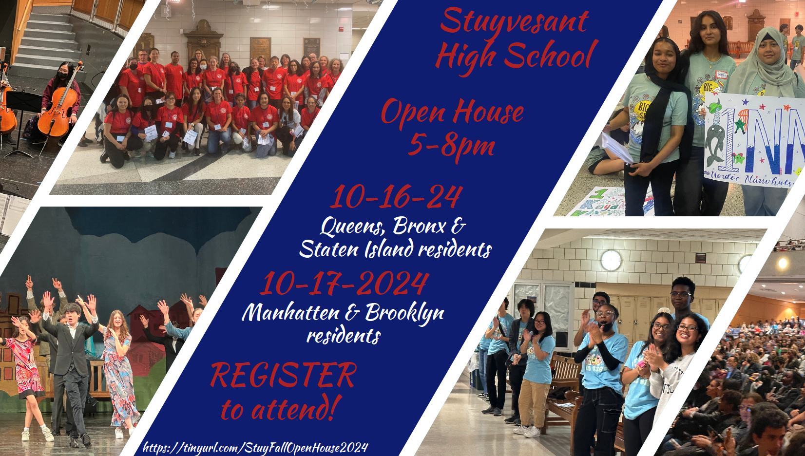 October 16 - 5:00 - 8:00pmIn-person Open House for families of middle schoolers who are residents of Queens, the Bronx, and Staten Island and interested in attending Stuyvesant.