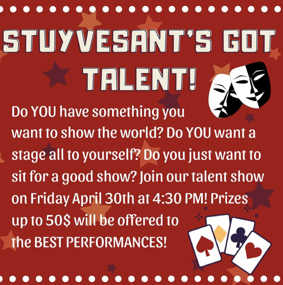 Join the Freshman Caucus on Friday, April 30th at 4:30 PM at STUYVESANT’S GOT TALENT! At this event, you have the opportunity to dazzle everyone with any special skills you have. And even if you don’t want to participate as a performer, you can join as a spectator and watch your peers put on a magnificent preformance. Whichever way you attend, you’re sure to have an incredible time!