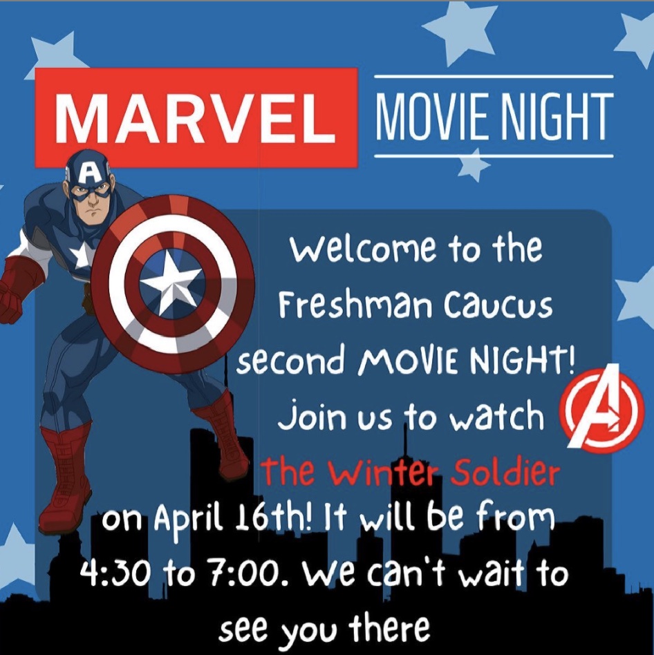 The Freshman Caucus invites freshies this Friday, April 16th, to come chill at their Marvel-themed movie night! They're going to be streaming Captain America: The Winter Soldier, though there won’t be an RSVP form this time. Instead, be sure to check your emails later this week for the Zoom link!