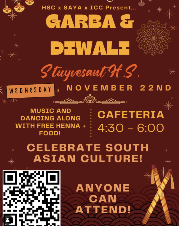 On Wednesday, November 22nd in the Cafeteria @ 4PM, the HSC, SAYA, and ICC are collaborating to bring the second Garba/Diwali formal to Stuyvesant! All students and staff are welcome and there will be lots of free food and henna. Accommodations will be made, ranging from halal all the way to vegetarian. Please fill out the RSVP form if you are interested.
