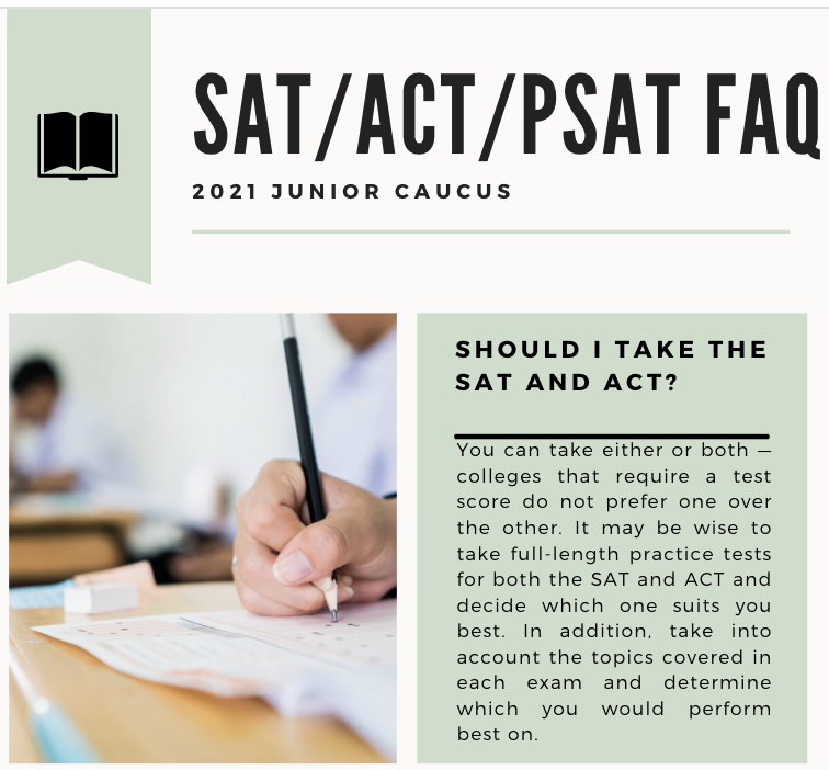 The Junior Caucus is happy to present their SAT/ACT/PSAT FAQ! You can access it through https://bit.ly/juniorsatfaq. Make sure to check it out for important information on testing days, fee waivers, studying tips, and everything else SAT/ACT/PSAT related!