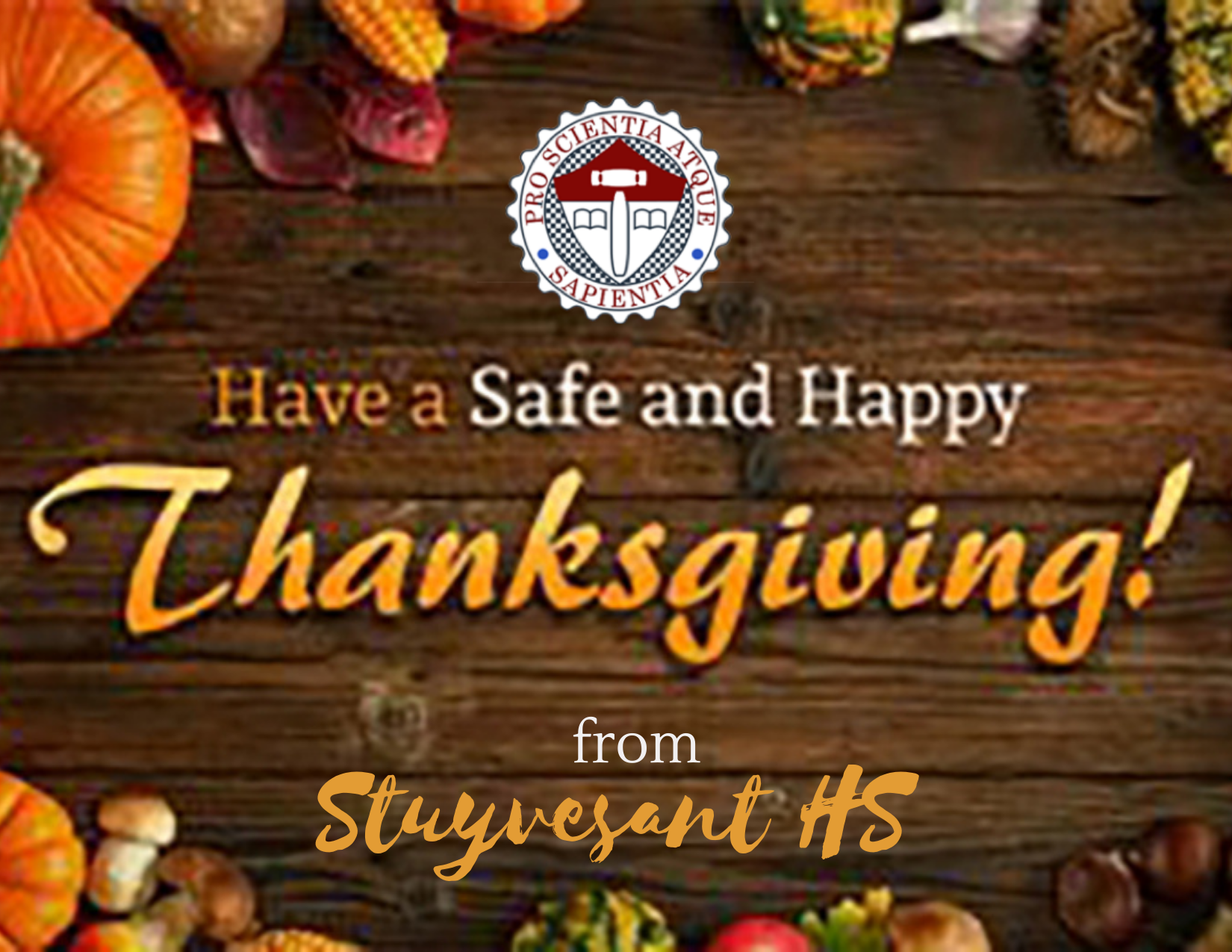Stuyvesant High School wishes all in our Stuy Family a Happy Thanksgiving holiday! As a reminder, school will be closed on Thursday and Friday, November 25, and 26. t will be a regular school day on Wednesday, November 24, 2021. Enjoy!