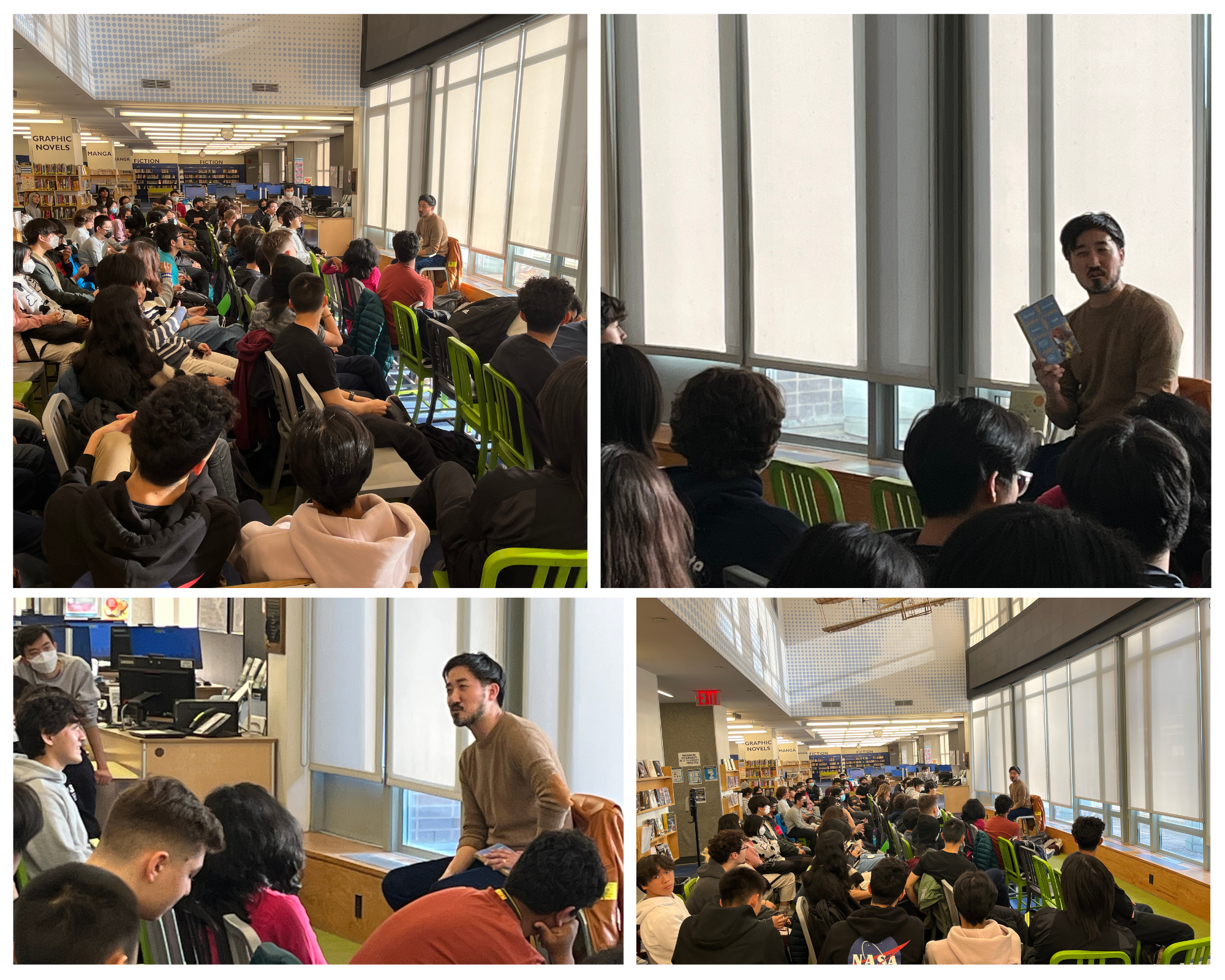 Dr. Emily Moore shares that Jason Koo, Professor and Brooklyn Poet's Founder visited Stuy last Friday, and three Poetry Workshop classes attended during 9th period for a reading. The Librarians created a wonderfully welcoming space and Dr. Moore's 100+ poets gathered around him afterwards for questions. See a full size collage here.