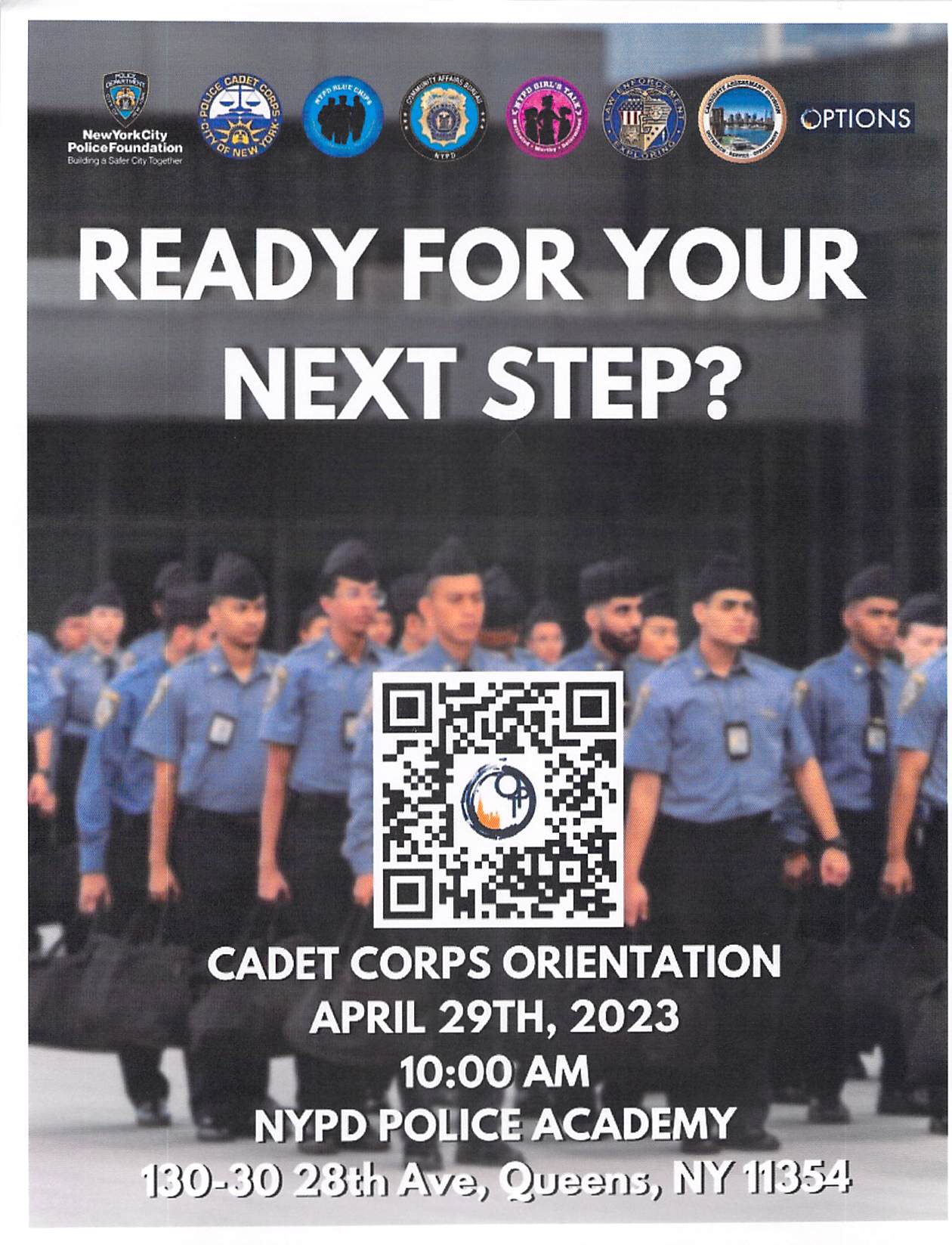 Join the NYPD Cadet Corps! Orientation is April 29, 2023 at 10am! Use the QR code for more information.