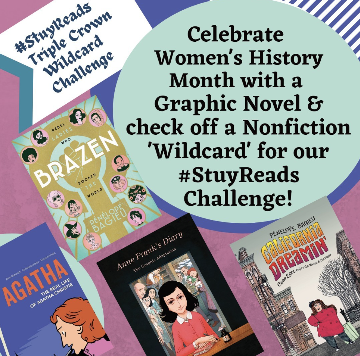 Celebrate #WomensHistoryMonth with one of these Graphic Novels & check off the Nonfiction 'Wildcard' category of our #StuyReads Triple Crown Wildcard Challenge! More info is at stuy.libguides.com.
