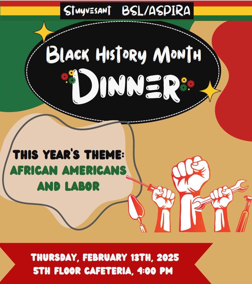 Students, staff, alumni are invited to join Stuyvesant's annual Black History Month dinner and celebration on Thursday, February 13 at 4pm in the cafeteria. There will be live music, cultural dishes, performances and more! this year's theme is African Americans and Labor. Register to attend at this Link.