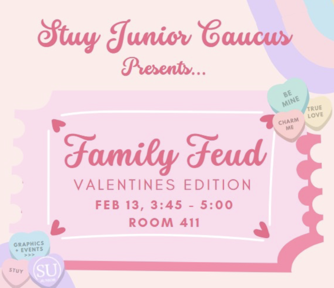 The Junior Caucus's Events Department is hosting a Valentine's Day themed Family Feud Event on February 13th, 2023 from 3:45 - 5 PM in Room 411!! Pull up to play some family feud (a team trivia game--you don't have to know how to play beforehand but here's an example: https://youtu.be/aZ_zLugqpew) with some friends or if you don't have a group we'll group you up on the day of! We'll also be giving out free prizes for the winning team! If you already have a group, only one person from each group needs to fill out this form.