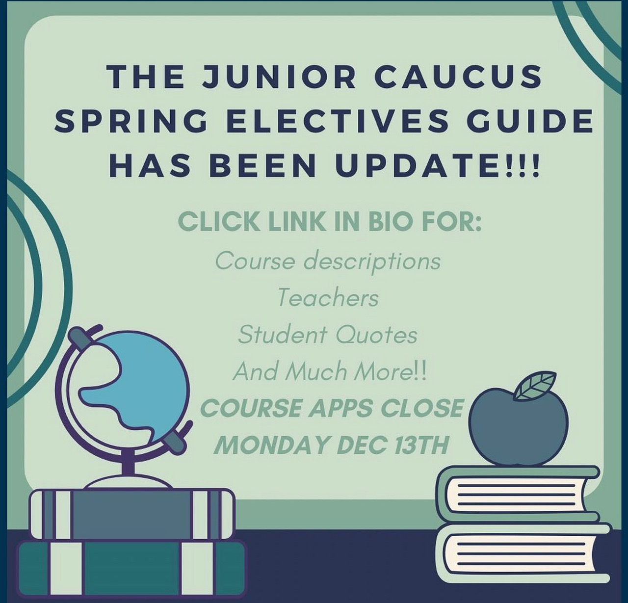 The Junior Caucus released their Spring 2022 electives guide to help out with all those questions students have! You can view the guide at this link: https://docs.google.com/document/d/1kayUTxpVzqT29fq3HmXojKEjMbsb05EsC0QX2CpvHgE/edit?usp=sharing