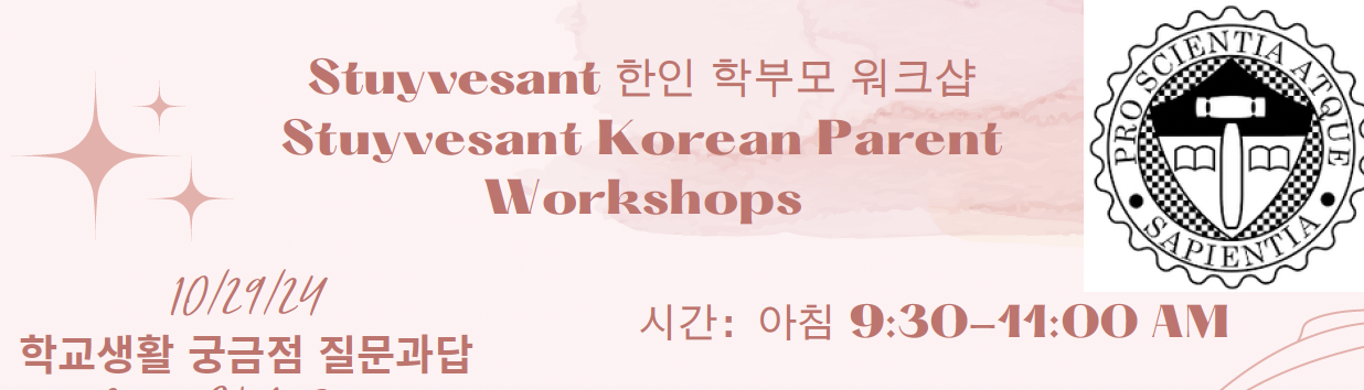 All Korean speaking parents and guardians are invited to join a Q&A session on October 29, 2024 at 9:30am at Stuyvesant in Lecture Hall A! This is the first in a three-part series of workshops for parents that will be presented completely in Korean by School Counselor Ms. Kristina Uy. The following two workshops will be held virtually over zoom on November 12 and 19, both at 9:30am.