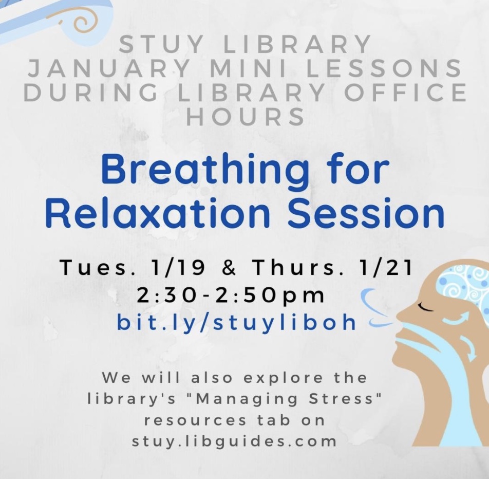 The Librarians are available Monday through Friday during Office Hours (2:30-2:50) bit.ly/stuyliboh or via email at Library@stuy.edu. Additional information is on the Library website stuy.libguides.com.
