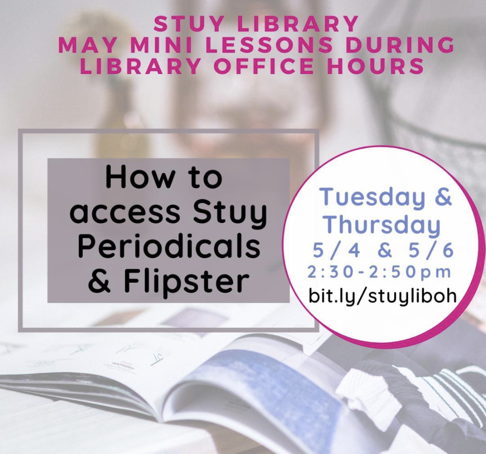 Join the librarians on Tuesdsay, 5/4 or Thursday, 5/6 for a special library session about Stuy's Digital Periodicals & NYPL's Flipster platform at bit.ly/stuyliboh during Office Hours at 2:30pm