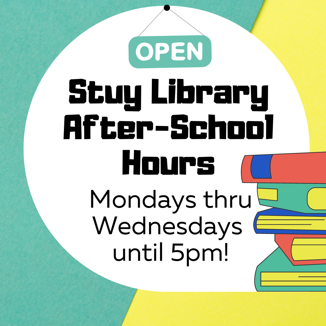 Need a quiet place to study after school? Come to the Stuy library for after-school hours Mondays, Tuesdays & Wednesdays until 5pm! A librarian is available to assist you with research, citations, reading recs, and more!