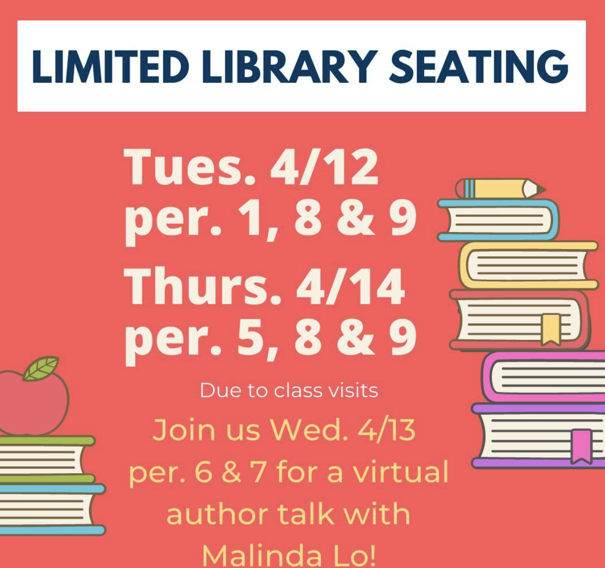 The library will have limited seating Tues. 4/12 per. 1, 8 & 9 and Thurs. 4/14 per. 5, 8 & 9. Join us for a virtual visit from author Malinda Lo this Wed. 4/13 per. 6 & 7 - Simply drop in if you are interested! Learn about her books and more about Malinda Lo here.