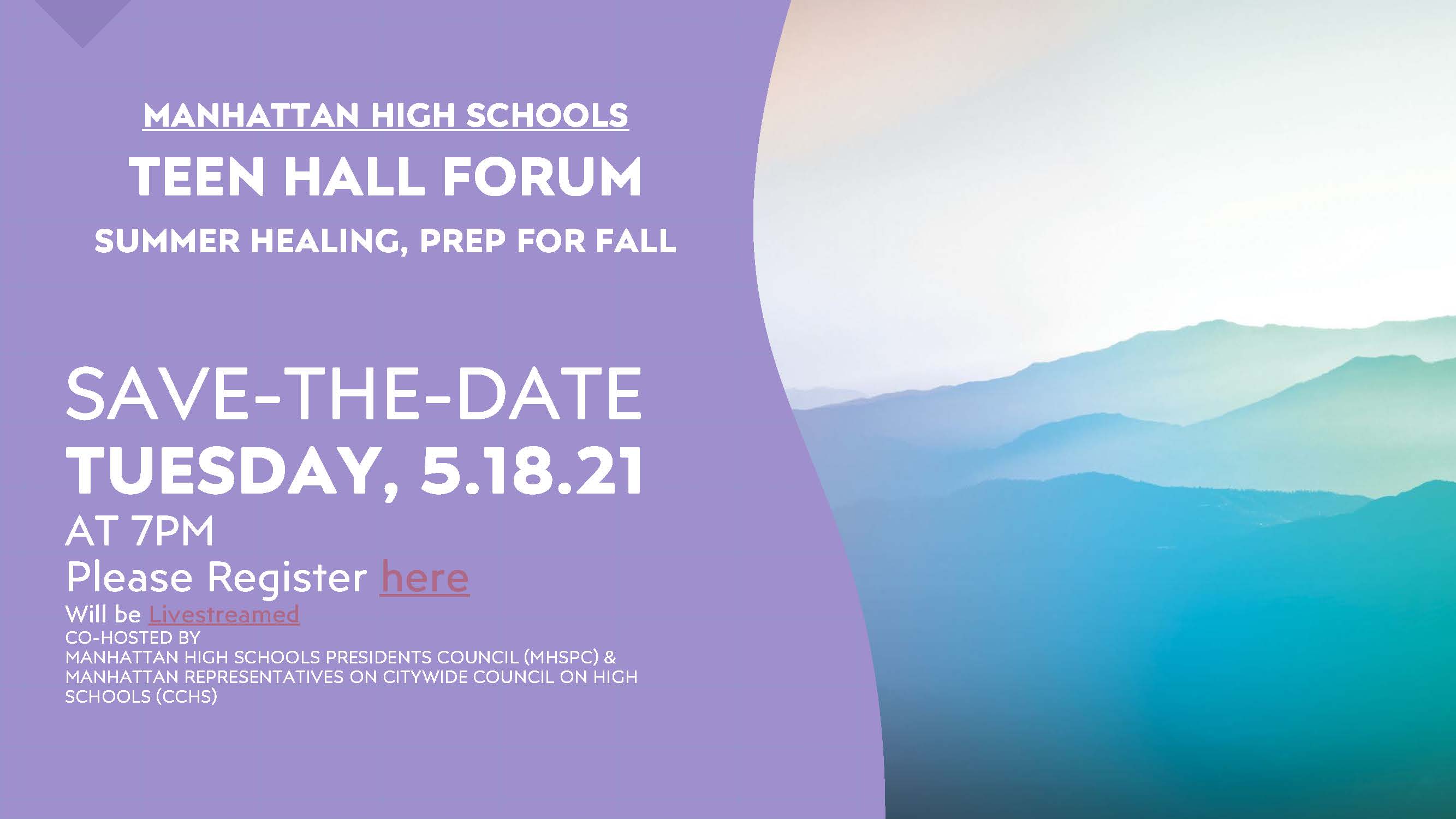 Register to attend the Manhattan High Schools Teen Hall Forum on Tuesday, May 18 at 7pm.