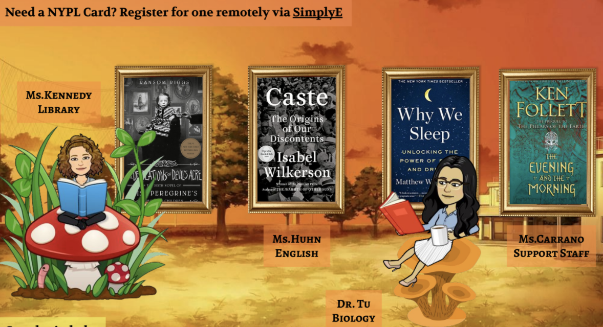 One thing we miss from being at Stuyvesant together is browsing all the book posters along the hallway to the Library entrance and outside of classrooms, where teachers and staff members share what they are currently reading. Here is a "virtual hallway" so we can catch up with what Stuy faculty, admins and staff have been reading lately! Make sure to click on the books to learn more about them. Thanks to Juniors Leo Lin and Ismath Maksura and Sophomore Ilana Livshits for creating the images and updating the reading selections!