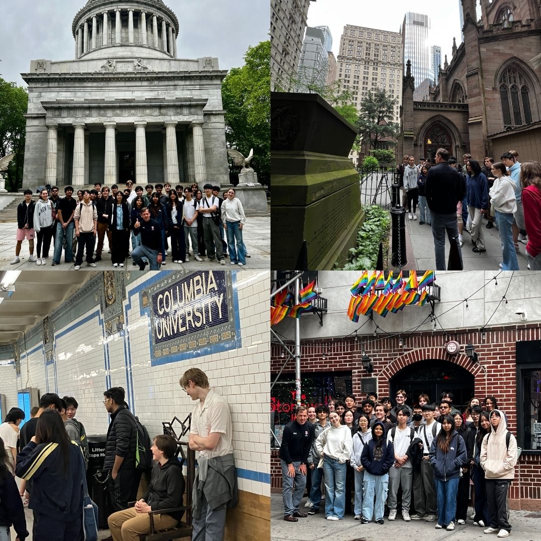 Mr. Hanna’s AP U.S. History class went on a field trip, visiting sites of national historical significance all over Manhattan. They started downtown at the Tweed Courthouse, walked onto the Brooklyn Bridge, and visited the burying ground at Trinity Church where Alexander Hamilton & his wife Eliza are buried. Then uptown to Grant’s Tomb in Riverside Park, Finally to Greenwich Village to see the Washington Arch, Triangle Fire Memorial, and Stonewall. Fortunately the rain held off just long enough before the first drops started to fall. See a full size photo collage. A big thank you to Sarah Buessing (mother of Jack Buessing ‘26), and Loren Borducci (mother of Siena Short ‘26) for helping chaperone the trip!