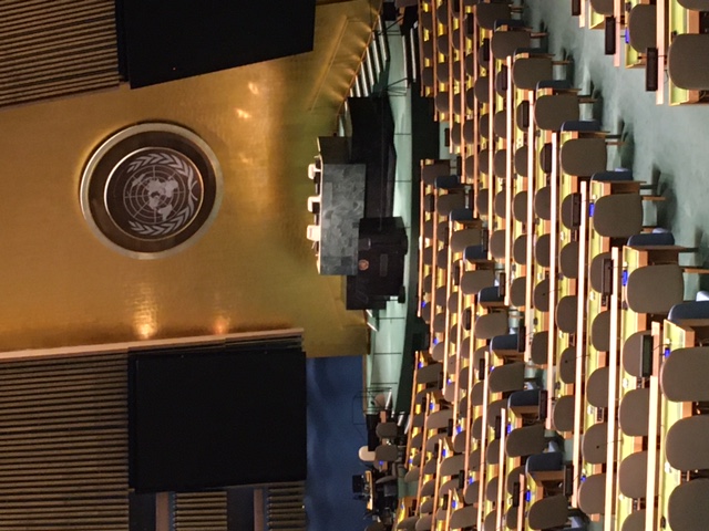 (group photo courtesy of Mr. Hanna, outside the UN with the Secretariat Building (Tower) in the background, and a photo of the empty General Assembly chambers)