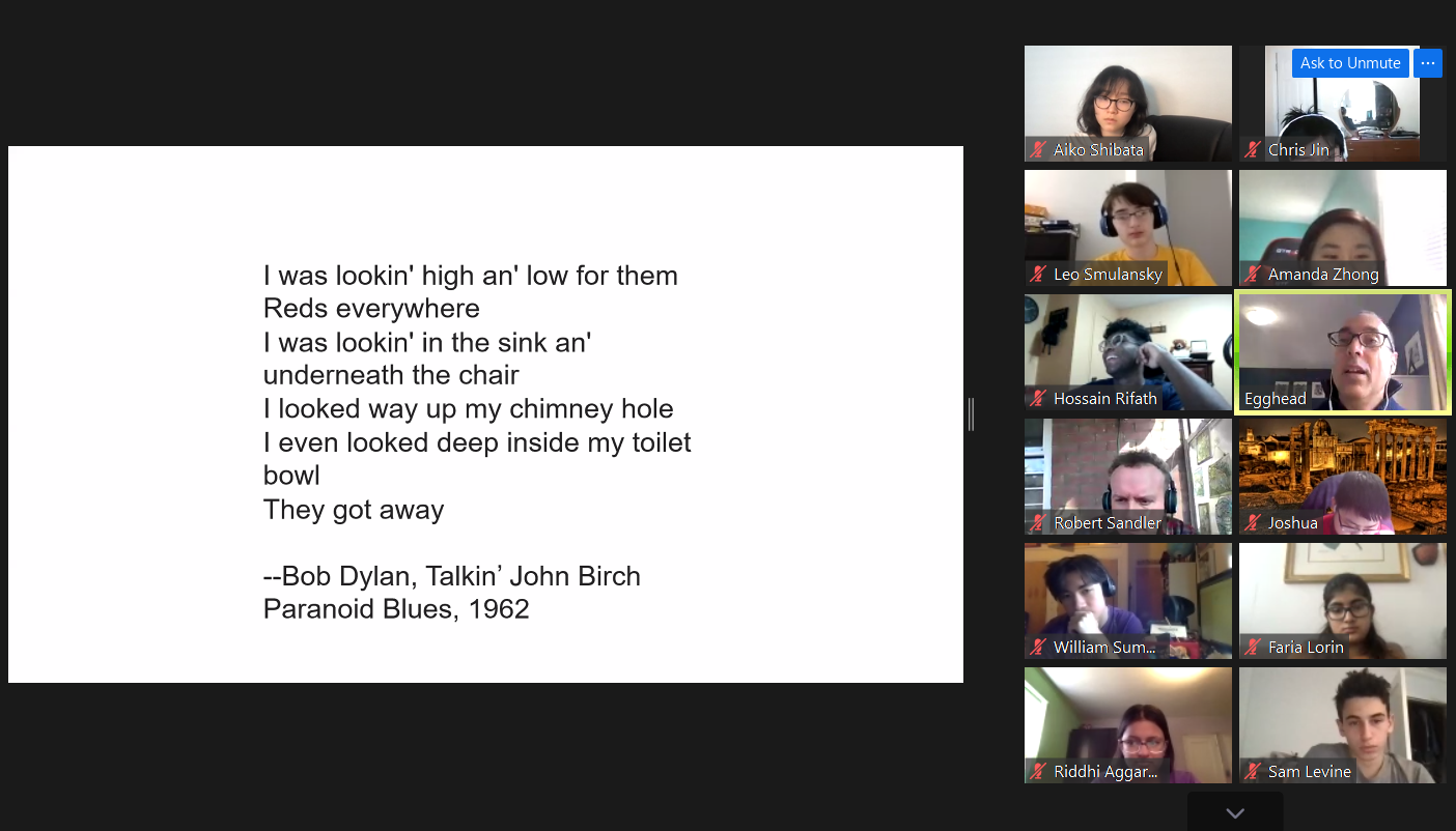 The image from the talk is shared. Students practiced historical thinking skills like analyzing song lyrics and other primary documents. We are so grateful Dr. Dallek was wiling to share his academic research and expose the students to the process of writing a scholarly work.