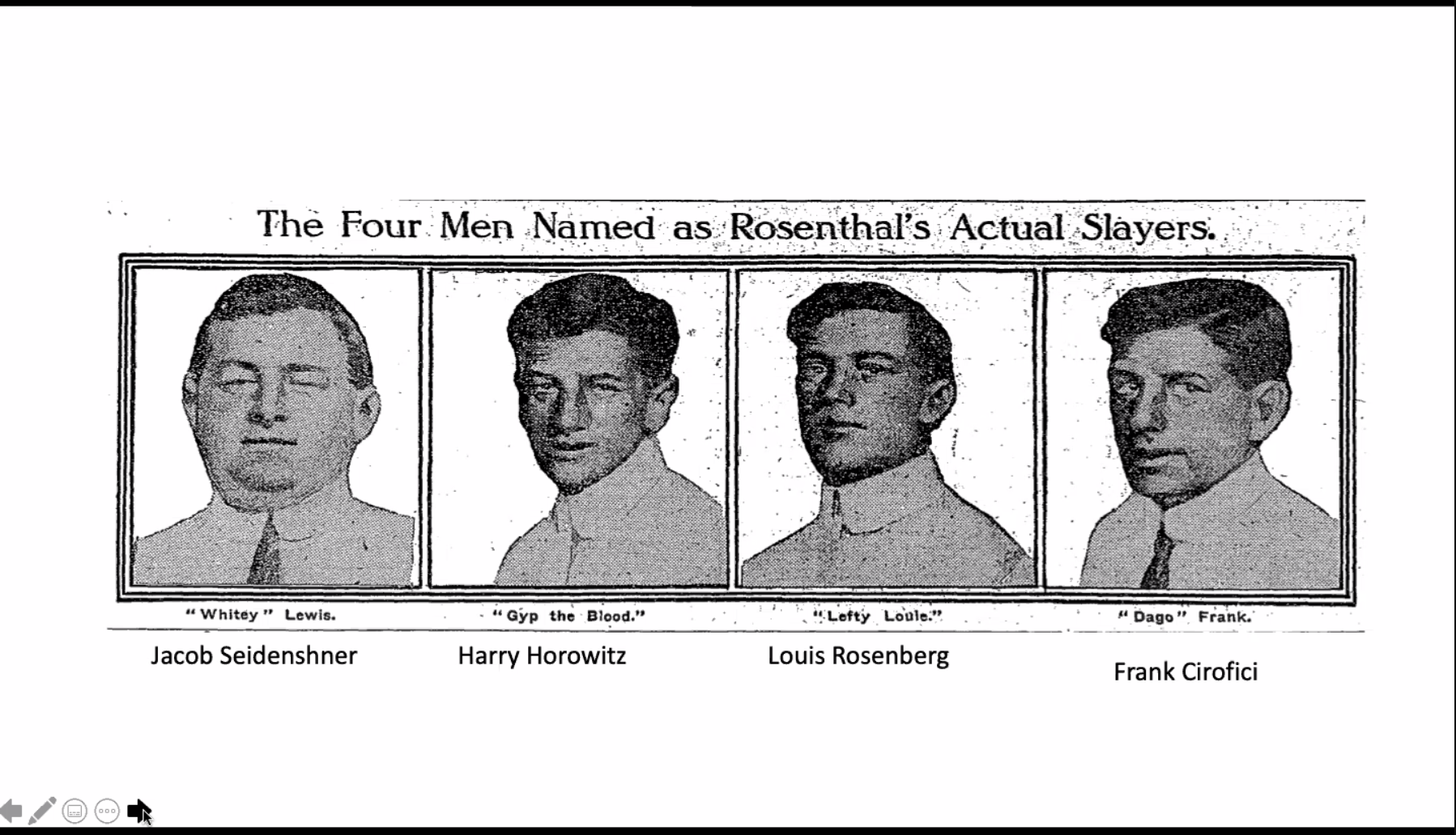 We learned about how the police inflated crime statistics to make nativist arguments to limit Jewish immigration, and how the Jewish community led by rabbis pushed back against organized crime with the development of the Bureau of Social Morals. We also looked at infamous Jewish gangsters like "Dopey" Benny Fein, and Jacob "Greaser" Rosenzweig, their connection with Tammany Hall and why the Jewish organized crime faded away. It was a enlightening presentation! " (photos courtesy of Ms. Sandler)