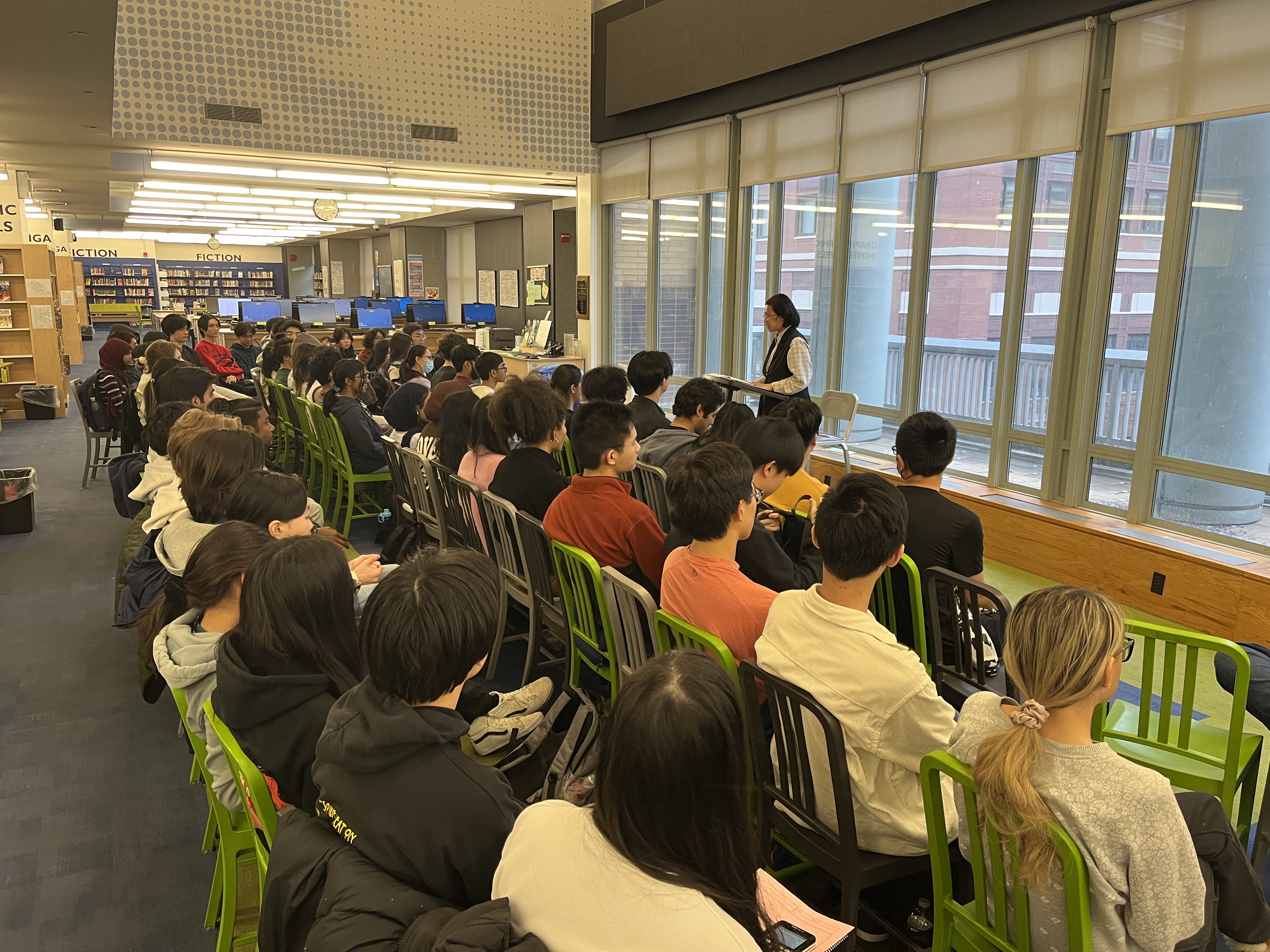 Stuy grad Tiffany Troy '14 spoke with two of Ms. Thoms's "Writing to Make Change" classes today then read to all three of my Poetry Workshop classes from her poetry collection in the Library this afternoon. Many thanks to the Librarians for making the larger reading possible and to Dina for helping me organize a small honorarium. Speaking about reading poetry on the subway while working full time as a private practice lawyer in Flushing, Tiffany told my poetry students "I think a lot of us can identify with reading, writing, and generally finishing our English Homework on the 7 train." It was so wonderful for Stuy students to hear from a writer who they can so clearly connect to.