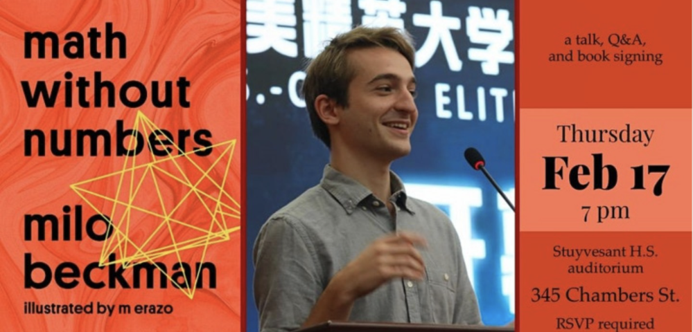 Join author Milo Beckman, Stuy '11 for a book release event of his latest, Math Without Numbers, on February 17, 2022 at 7:00pm in the Murray Kahn Theater at Stuyvesant High School.