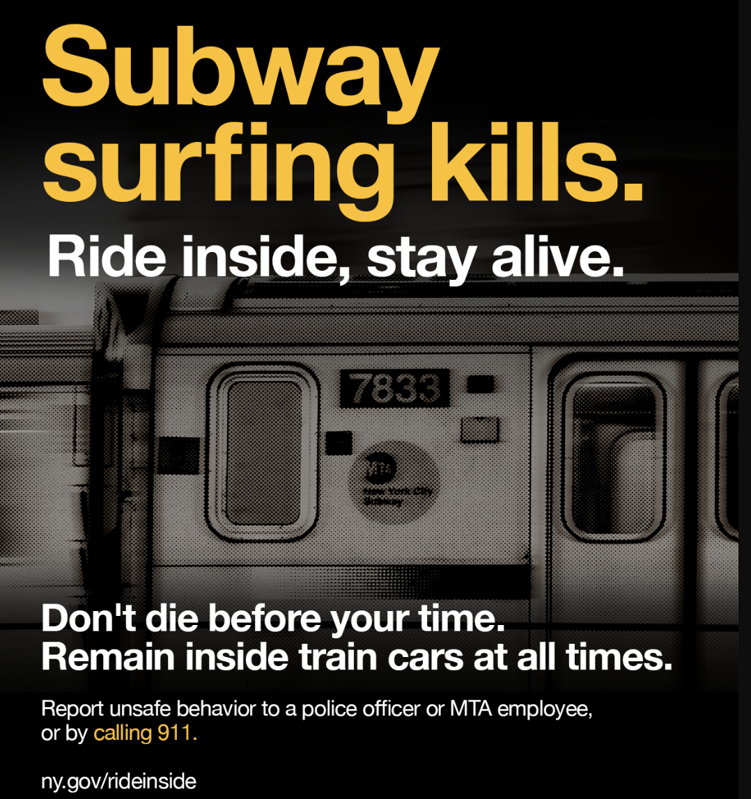 In an effort to promote student safety and as part of a larger citywide interagency subway safety campaign, all students my print this Anti-Subway Surfing palm card. Check out theAnti-Subway Surfing posters throughout our school. Stay Alive; Ride Inside!