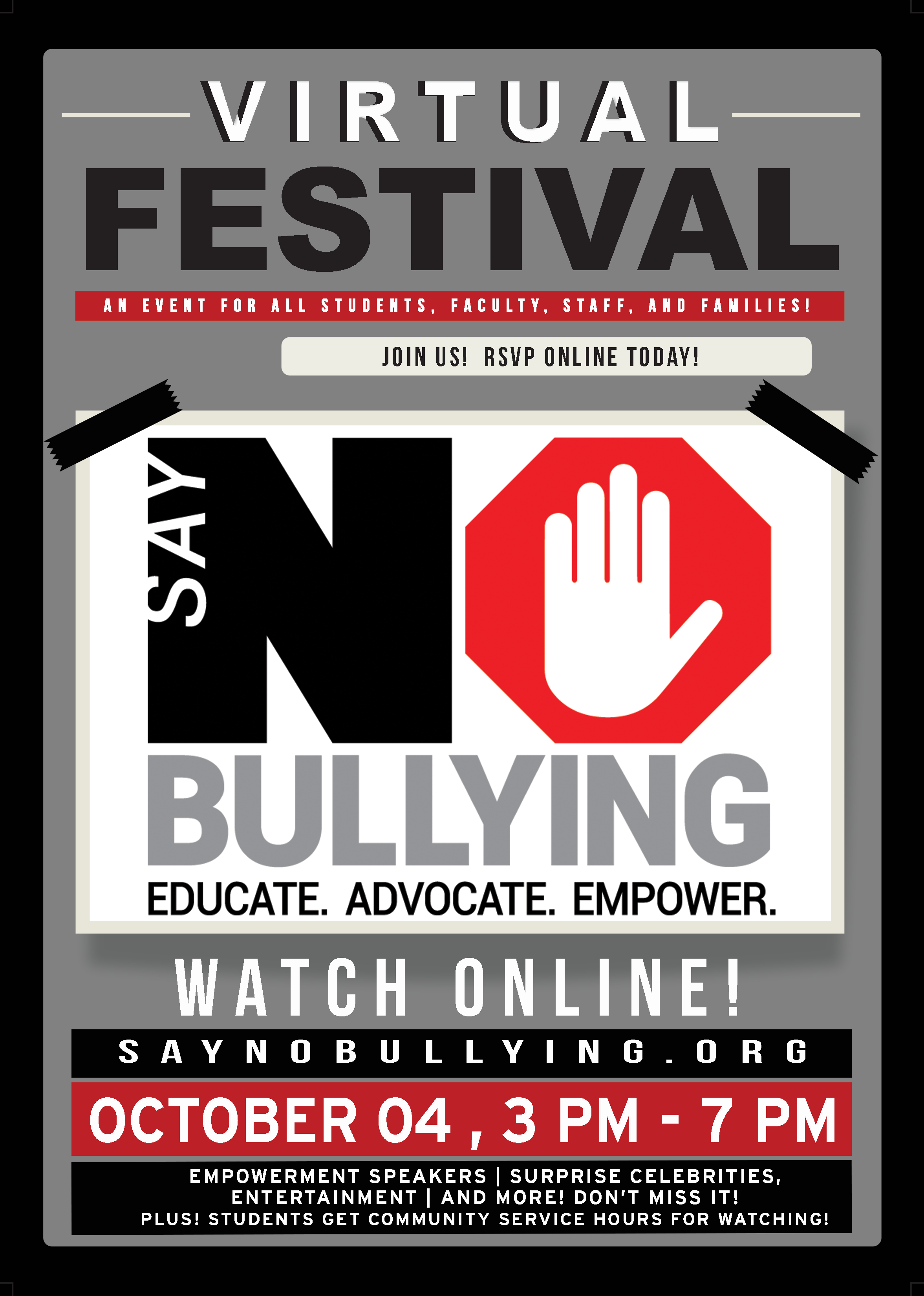 The Say NO Bullying Virtual Festival will educate, advocate, and empower students, faculty, and staff about bullying in an effort to create a safe school environment for everyone. The event will feature empowerment speakers, celebrities, and entertainment.