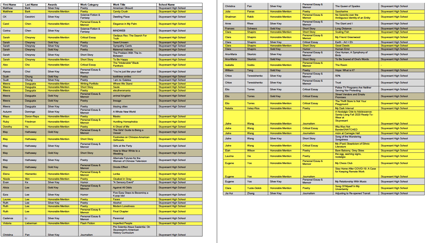 Congratulations to 40 of our amazing Stuyvesant students who were honored at the 2021 NYC Scholastic Art & Writing Awards Ceremony at the YouTube Premiere on Thursday, March 4 for their achievements in Writing in the 2021 Scholastic Writing Gold Key, Silver Key and Honorable Mention recognition.