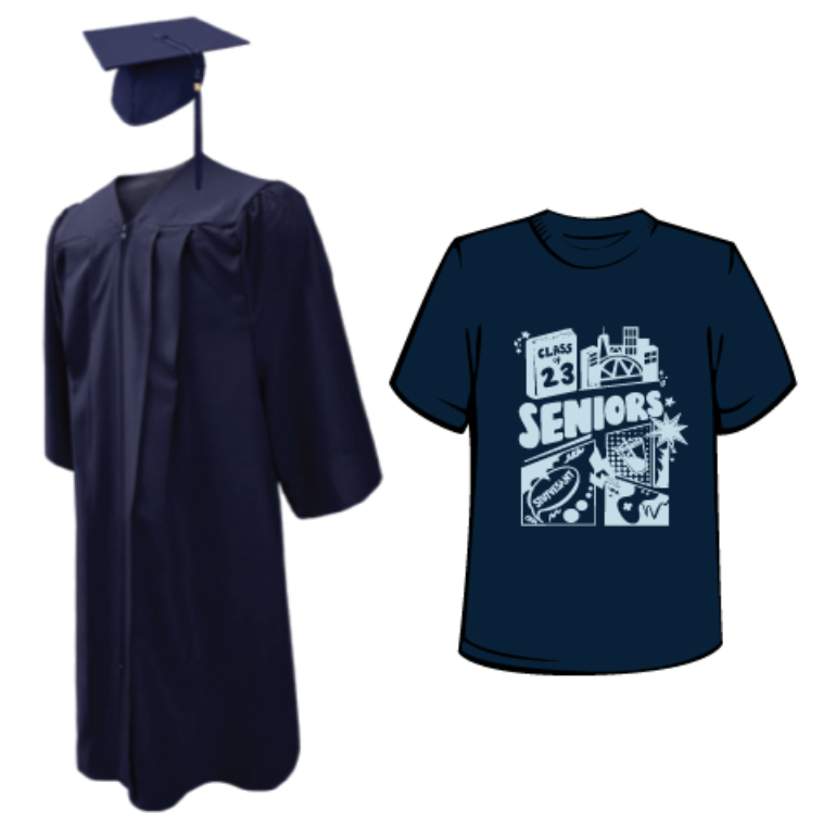 The package comes with the cap & gown and '23 tassel for graduation and the senior T-Shirt custom design for Class of 2023. The total package is $62.49 before any tax or shipping costs. The link to purchase is here (https://bit.ly/stuygraduation2023).