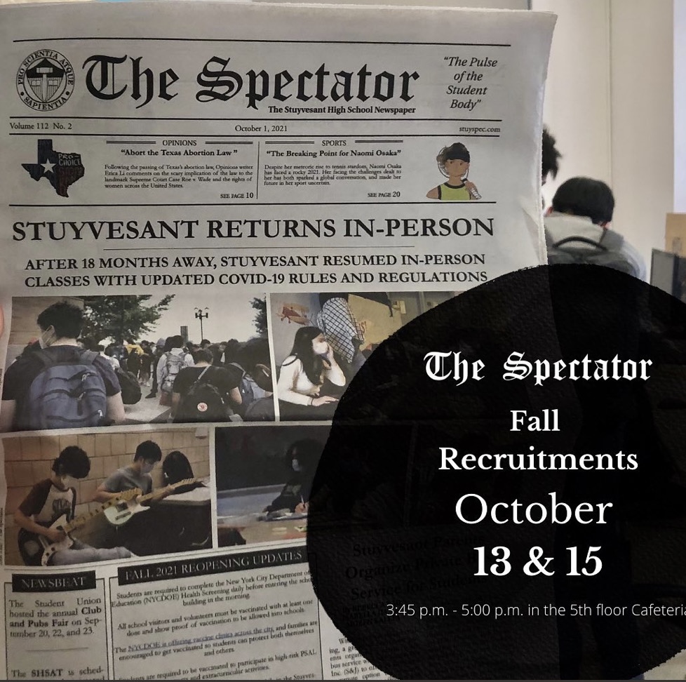 Come learn about Stuyvesant’s biweekly student-run newspaper, The Spectator, at our fall Recruitments. At this event, we will cover each of our 7 writing (News, Features, Opinions, Science, A&E, Humor, Sports) and 6 non-writing (Copy, Business, Photo, Art, Layout, Web) departments and what they do and/or cover.