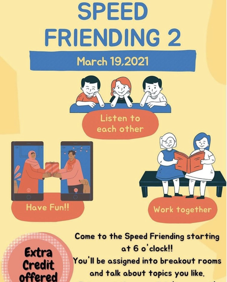 The Student Union is excited to announce that we will be hosting a second Speed-Friending Event on Friday, March 19th at 6:00pm. After a very successful first Speed-Friending Event, attended by nearly 200 students, they wanted to give students another opportunity to meet new people and make friends. Students will be placed into breakout rooms where you’ll be able to engage with peers in small groups, guided by fun icebreakers.