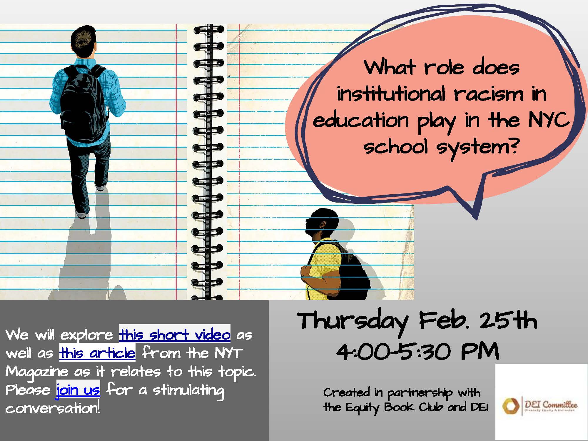 Stuyvesant Staff members are invited to the 3rd Equity Book Talk of the school year, presented by the Equity Book Club and the DEI Committee. Please join us from 4:00-5:30 PM on Thursday, February 25th to discuss the role of institutional racism in the NYC School system. Please register for the event here or at the link.