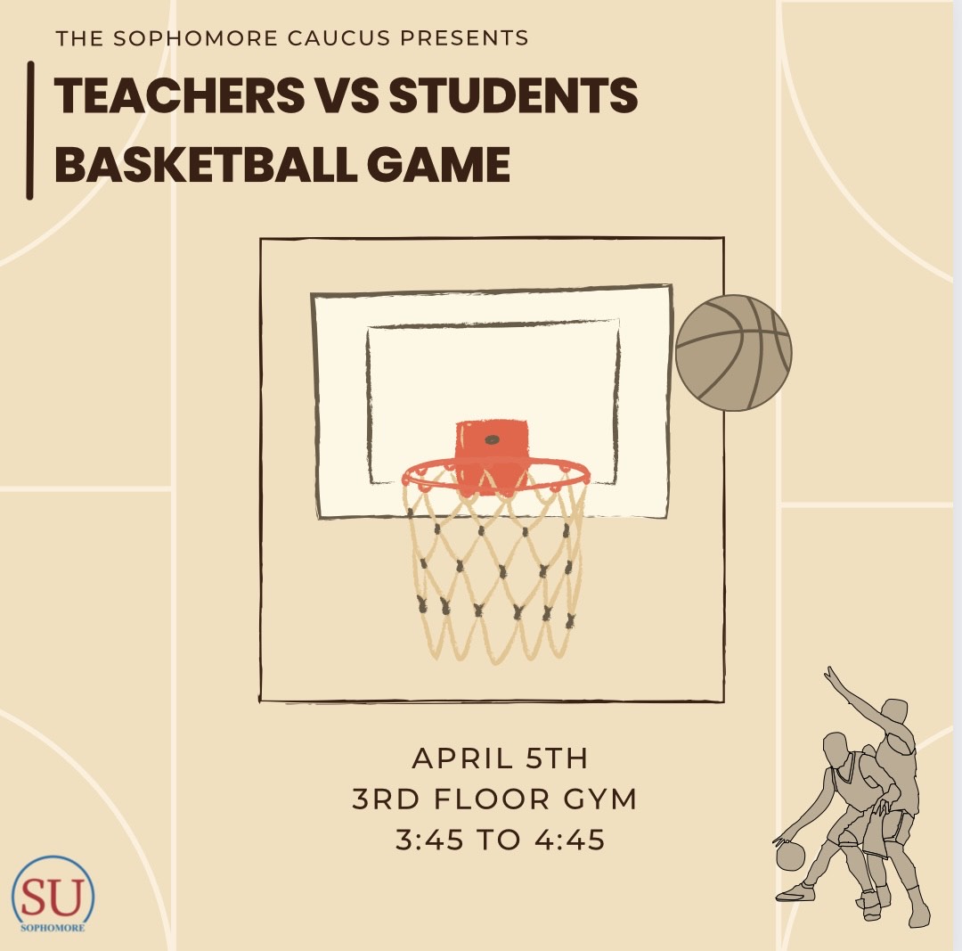 The Sophomore Caucus is hosting a Student Teacher Basketball Game on April 5th, 3:45 PM to 5:00 PM, in the 3rd floor gym. Come cross up Mx. Stuzin, Principal Yu, Mr. Moran, Security Guards Young and Haliburton, and many more!