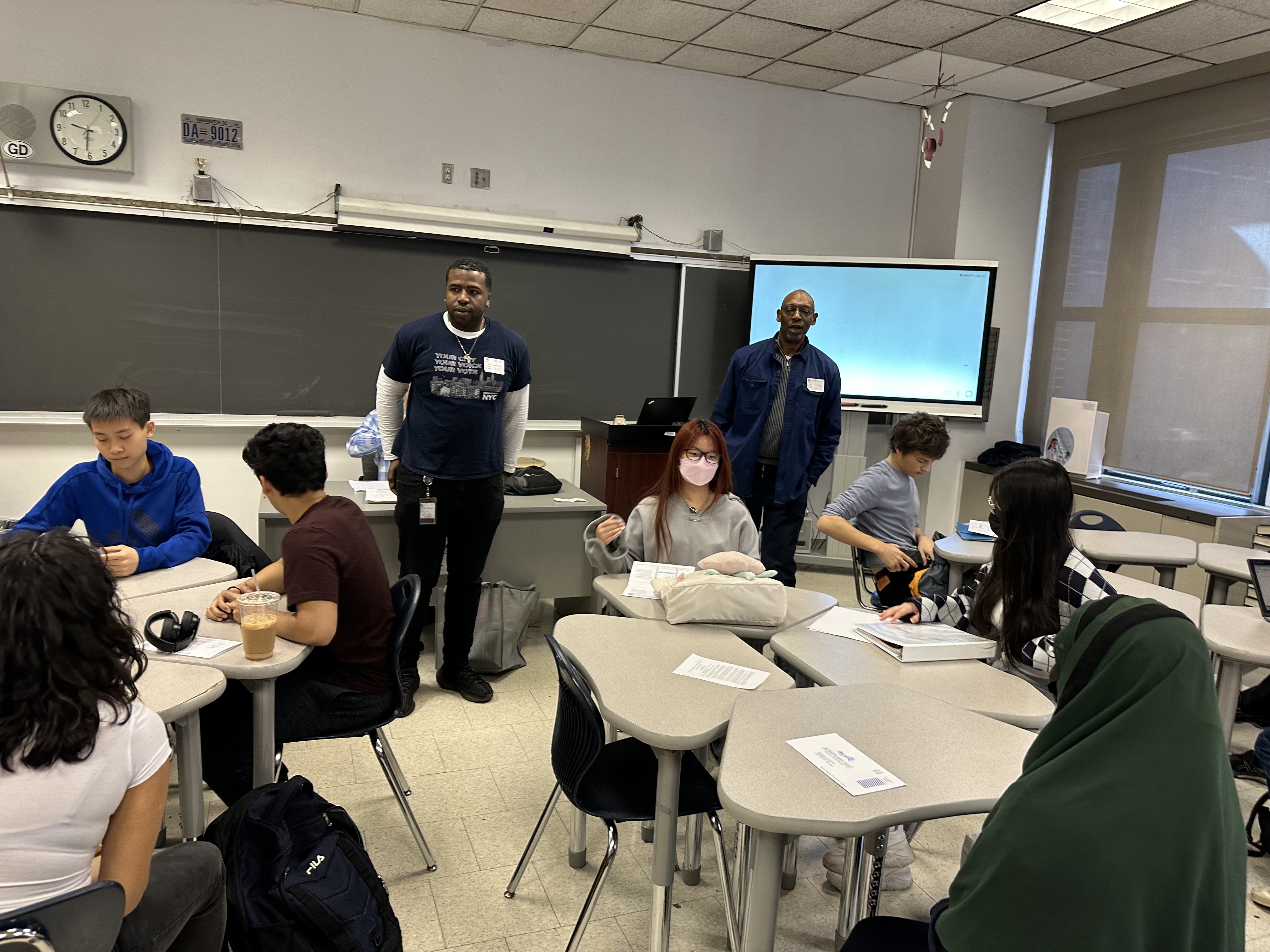 Staff members from Mayor Eric Adams' office visited Stuyvesant last week during Civics Week and spoke to students in social studies classes about the importance of registering to vote. A table was set up on the 2nd floor for the week for Stuyvesant's voter registration drive. (photo courtesy of Ms. Suri)